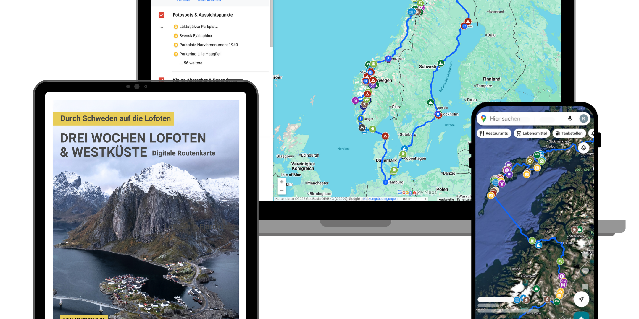 Die Lofoten rufen! Reise mit unserer digitalen Routenkarte entlang der schwedischen Ostküste, mit Stopps in Stockholm und im Abisko-Nationalpark, auf schnellstem Weg in Richtung der magischen Inselkette. Zurück auf dem Festland warten die norwegischen Fjordlande auf dich: Es gilt, die spektakulärsten Panoramastraßen, Fjelle und einige der schönsten Wanderungen und Aussichten des Landes zu entdecken.