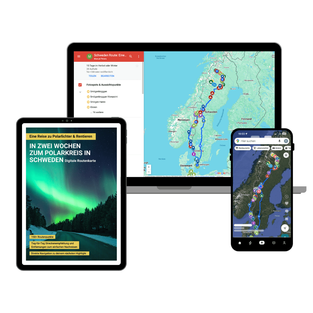 Du träumst schon immer davon, einmal die Nordlichter über den gefrorenen Weiten und Seen von schwedisch Lappland tanzen zu sehen? Du liebst du ruhige Jahreszeit mit malerischen Sonnenuntergängen und dem schönsten rosafarbenen Himmel? Das aufregende Gefühl, dass hinter jeder Straßenbiegung Rentiere und Elche auf dich warten können, während du einige der besondersten Nationalparks des Landes erkundest? Dann ist diese Route genau die richtige für dich!